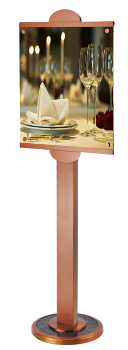 商场指示牌的底座由金属边框加大理石结合,够稳重、美观、高档。顶部展示面采用透明亚克力面板,更随时更换内容,展示面可选直面或斜面,是商场柜台或物业大堂摆放的必备品。